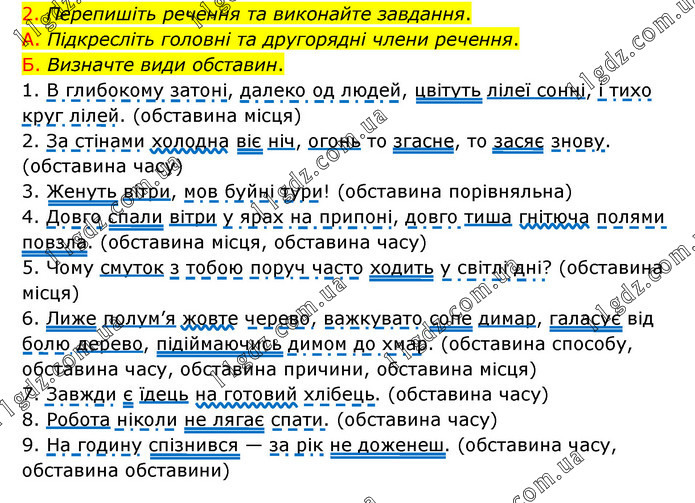 Перепишіть речення та виконайте завдання. А. Підкресліть головні та другорядні члени речення. Б. Визначте види обставин. 1. В глибокому затоні, далеко од людей, цвітуть лілеї сонні, і тихо круг лілей. (обставина місця) 2. За стінами холодна віє ніч, огонь то згасне, то засяє знову. (обставина часу) 3. Женуть вітри, мов буйні тури! (обставина порівняльна) 4. Довго спали вітри у ярах на припоні, довго тиша гнітюча полями повзла. (обставина місця, обставина часу) 5. Чому смуток з тобою поруч часто ходить у світлі дні? (обставина місця) 6. Лиже полум’я жовте черево, важкувато сопе димар, галасує від болю дерево, підіймаючись димом до хмар. (обставина способу, обставина часу, обставина причини, обставина місця) 7. Завжди є їдець на готовий хлібець. (обставина часу) 8. Робота ніколи не лягає спати. (обставина часу) 9. На годину спізнився — за рік не доженеш. (обставина часу, обставина обставини)