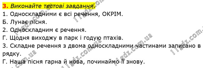 Виконайте тестові завдання. 1. Односкладними є всі речення, ОКРІМ. Б. Лунає пісня. 2. Односкладним є речення. Г. Щодня виходжу в парк і годую птахів. 3. Складне речення з двома односкладними частинами записано в рядку. Г. Наша пісня гарна й нова, починаймо її знову.