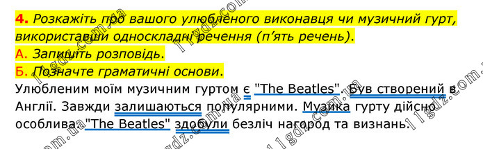 Розкажіть про вашого улюбленого виконавця чи музичний гурт, використавши односкладні речення (п’ять речень). А. Запишіть розповідь. Б. Позначте граматичні основи. Улюбленим моїм музичним гуртом є "The Beatles". Був створений в Англії. Завжди залишаються популярними. Музика гурту дійсно особлива. "The Beatles" здобули безліч нагород та визнань.