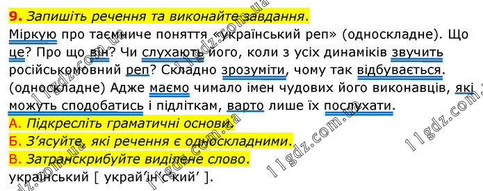 Запишіть речення та виконайте завдання. Міркую про таємниче поняття «український реп» (односкладне). Що це? Про що він? Чи слухають його, коли з усіх динаміків звучить російськомовний реп? Складно зрозуміти, чому так відбувається. (односкладне) Адже маємо чимало імен чудових його виконавців, які можуть сподобатись і підліткам, варто лише їх послухати. A. Підкресліть граматичні основи. Б. З’ясуйте, які речення є односкладними. B. Затранскрибуйте виділене слово. український [ украй’і́н’с’кий’ ].