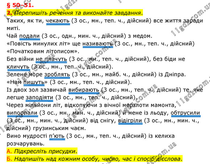 § 50–51. 2. Перепишіть речення та виконайте завдання. Таких, як ти, чекають (3 ос., мн., теп. ч., дійсний) все життя заради миті. Чай подали (3 ос., одн., мин. ч., дійсний) з медом. «Повість минулих літ» ще називають (3 ос., мн., теп. ч., дійсний) «Початковим літописом». Без війни не плачуть (3 ос., мн., теп. ч., дійсний), без біди не кличуть (3 ос., мн., теп. ч., дійсний). Зелене море зроблять (3 ос., мн., майб. ч., дійсний) із Дніпра. «Нам пишуть» (3 ос., мн., теп. ч., дійсний). Із двох зол зазвичай вибирають (3 ос., мн., теп. ч., дійсний) те, яке легше заподіяти (3 ос., мн., теп. ч., дійсний). Через мільйони літ, відкопуючи з вічної мерзлоти мамонта, випорпали (3 ос., мн., мин. ч., дійсний) й мене із льоду, обтрусили (3 ос., мн., мин. ч., дійсний) від снігу, відігріли (3 ос., мн., мин. ч., дійсний) грузинським чаєм. Вино мудрості п’ють (3 ос., мн., теп. ч., дійсний) із келиха розчарувань. А. Підкресліть присудки. Б. Надпишіть над кожним особу, число, час і спосіб дієслова.