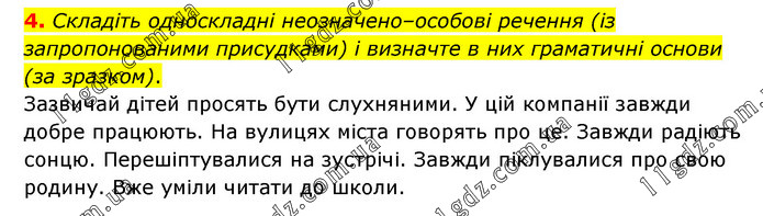 Складіть односкладні неозначено–особові речення (із запропонованими присудками) і визначте в них граматичні основи (за зразком). Зазвичай дітей просять бути слухняними. У цій компанії завжди добре працюють. На вулицях міста говорять про це. Завжди радіють сонцю. Перешіптувалися на зустрічі. Завжди піклувалися про свою родину. Вже уміли читати до школи.