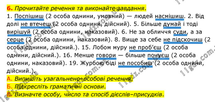 Прочитайте речення та виконайте завдання. 1. Поспішиш (2 особа однини, умовний) — людей насмішиш. 2. Від долі не втечеш (2 особа однини, дійсний). 5. Більше думай і тоді вирішуй (2 особа однини, наказовий). 6. Не за обличчя суди, а за серце (2 особа однини, наказовий). 8. Вище за себе не підскочиш (2 особа однини, дійсний.). 15. Лобом муру не проб’єш (2 особа однини, дійсний.). 16. Менше говори — більше почуєш (2 особа однини, наказовий). 19. Журбою біді не пособиш (2 особа однини, дійсний.). A. Випишіть узагальнено–особові речення. Б. Підкресліть граматичні основи. B. Визначте особу, число та спосіб дієслів–присудків.