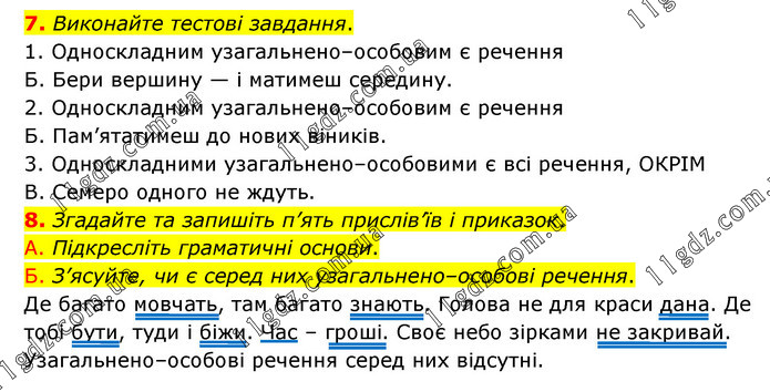 Виконайте тестові завдання. 1. Односкладним узагальнено–особовим є речення Б. Бери вершину — і матимеш середину. 2. Односкладним узагальнено–особовим є речення Б. Пам’ятатимеш до нових віників. 3. Односкладними узагальнено–особовими є всі речення, ОКРІМ В. Семеро одного не ждуть. 8. Згадайте та запишіть п’ять прислів’їв і приказок. А. Підкресліть граматичні основи. Б. З’ясуйте, чи є серед них узагальнено–особові речення. Де багато мовчать, там багато знають. Голова не для краси дана. Де тобі бути, туди і біжи. Час – гроші. Своє небо зірками не закривай. Узагальнено–особові речення серед них відсутні.