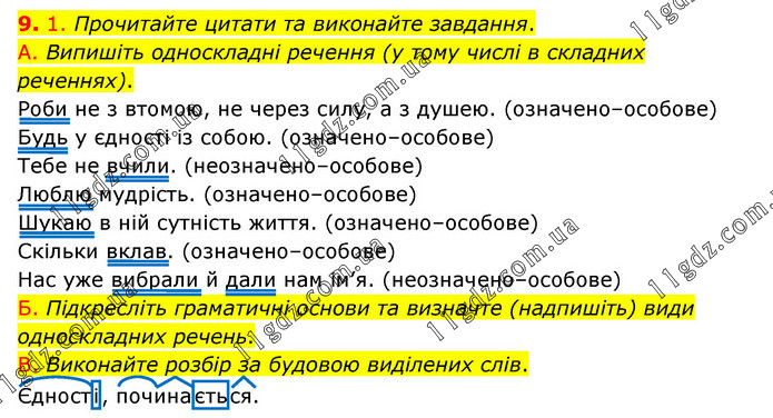 1. Прочитайте цитати та виконайте завдання. A. Випишіть односкладні речення (у тому числі в складних реченнях). Роби не з втомою, не через силу, а з душею. (означено–особове) Будь у єдності із собою. (означено–особове) Тебе не вчили. (неозначено–особове) Люблю мудрість. (означено–особове) Шукаю в ній сутність життя. (означено–особове) Скільки вклав. (означено–особове) Нас уже вибрали й дали нам ім’я. (неозначено–особове) Б. Підкресліть граматичні основи та визначте (надпишіть) види односкладних речень. B. Виконайте розбір за будовою виділених слів. Єдності, починається.