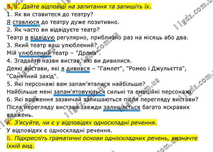 1. Дайте відповіді на запитання та запишіть їх. 1. Як ви ставитеся до театру? Я ставлюся до театру дуже позитивно. 2. Як часто ви відвідуєте театр? Театр я відвідую регулярно, приблизно раз на місяць або два. 3. Який театр ваш улюблений? Мій улюблений театр – "Драма". 4. Згадайте назви вистав, які ви дивилися. Деякі вистави, які я дивився – "Гамлет", "Ромео і Джульєтта", "Сонячний захід". 5. Які персонажі вам запам’яталися найбільше? Найбільше мені запам'ятовуються сильні та емоційні персонажі. 6. Які враження зазвичай залишаються після перегляду вистави? Після перегляду вистави завжди залишається багато яскравих вражень. А. З’ясуйте, чи є у відповідях односкладні речення. У відповідях є односкладні речення. Б. Підкресліть граматичні основи односкладних речень, визначте їхній вид.