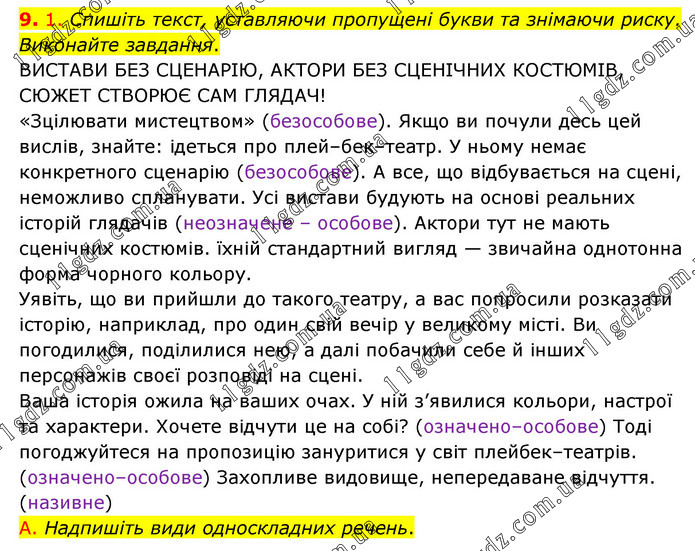 1. Спишіть текст, уставляючи пропущені букви та знімаючи риску. Виконайте завдання. ВИСТАВИ БЕЗ СЦЕНАРІЮ, АКТОРИ БЕЗ СЦЕНІЧНИХ КОСТЮМІВ, СЮЖЕТ СТВОРЮЄ САМ ГЛЯДАЧ! «Зцілювати мистецтвом» (безособове). Якщо ви почули десь цей вислів, знайте: ідеться про плей–бек–театр. У ньому немає конкретного сценарію (безособове). А все, що відбувається на сцені, неможливо спланувати. Усі вистави будують на основі реальних історій глядачів (неозначене – особове). Актори тут не мають сценічних костюмів. їхній стандартний вигляд — звичайна однотонна форма чорного кольору. Уявіть, що ви прийшли до такого театру, а вас попросили розказати історію, наприклад, про один свій вечір у великому місті. Ви погодилися, поділилися нею, а далі побачили себе й інших персонажів своєї розповіді на сцені. Ваша історія ожила на ваших очах. У ній з’явилися кольори, настрої та характери. Хочете відчути це на собі? (означено–особове) Тоді погоджуйтеся на пропозицію зануритися у світ плейбек–театрів. (означено–особове) Захопливе видовище, непередаване відчуття. (називне) А. Надпишіть види односкладних речень.