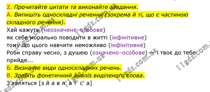 Прочитайте цитати та виконайте завдання. A. Випишіть односкладні речення (зокрема й ті, що є частиною складного речення). Хай кажуть (неозначене–особове) як себе морально поводити в житті (інфінітивне) тому що цього навчити неможливо (інфінітивне) Роби справу чесно, з душею (означено–особове) — і твоє до тебе прийде... Б. Визначте види односкладних речень. B. Зробіть фонетичний аналіз виділеного слова. З’являться [з й а в л' а т' с' а]