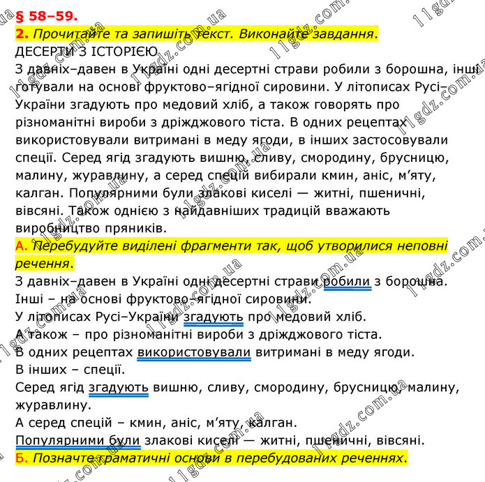 § 58–59. 2. Прочитайте та запишіть текст. Виконайте завдання. ДЕСЕРТИ З ІСТОРІЄЮ З давніх–давен в Україні одні десертні страви робили з борошна, інші готували на основі фруктово–ягідної сировини. У літописах Русі–України згадують про медовий хліб, а також говорять про різноманітні вироби з дріжджового тіста. В одних рецептах використовували витримані в меду ягоди, в інших застосовували спеції. Серед ягід згадують вишню, сливу, смородину, брусницю, малину, журавлину, а серед спецій вибирали кмин, аніс, м’яту, калган. Популярними були злакові киселі — житні, пшеничні, вівсяні. Також однією з найдавніших традицій вважають виробництво пряників. А. Перебудуйте виділені фрагменти так, щоб утворилися неповні речення. З давніх–давен в Україні одні десертні страви робили з борошна. Інші – на основі фруктово–ягідної сировини. У літописах Русі–України згадують про медовий хліб. А також – про різноманітні вироби з дріжджового тіста. В одних рецептах використовували витримані в меду ягоди. В інших – спеції. Серед ягід згадують вишню, сливу, смородину, брусницю, малину, журавлину. А серед спецій – кмин, аніс, м’яту, калган. Популярними були злакові киселі — житні, пшеничні, вівсяні. Б. Позначте граматичні основи в перебудованих реченнях.