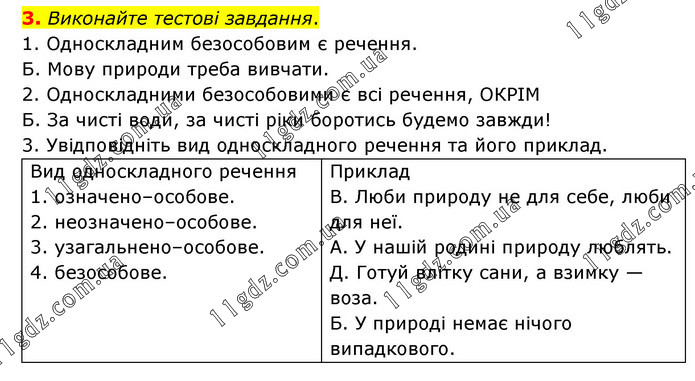 Виконайте тестові завдання. 1. Односкладним безособовим є речення. Б. Мову природи треба вивчати. 2. Односкладними безособовими є всі речення, ОКРІМ Б. За чисті води, за чисті ріки боротись будемо завжди! 3. Увідповідніть вид односкладного речення та його приклад. Вид односкладного речення 1. означено–особове. 2. неозначено–особове. 3. узагальнено–особове. 4. безособове. Приклад В. Люби природу не для себе, люби для неї. А. У нашій родині природу люблять. Д. Готуй влітку сани, а взимку — воза. Б. У природі немає нічого випадкового.
