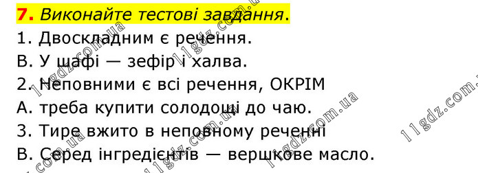 Виконайте тестові завдання. 1. Двоскладним є речення. В. У шафі — зефір і халва. 2. Неповними є всі речення, ОКРІМ А. треба купити солодощі до чаю. 3. Тире вжито в неповному реченні В. Серед інгредієнтів — вершкове масло.