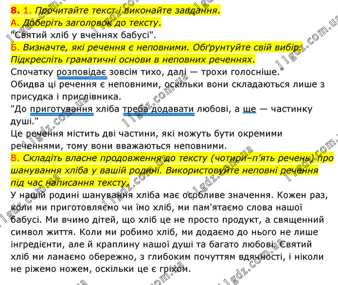 1. Прочитайте текст і виконайте завдання. А. Доберіть заголовок до тексту. "Святий хліб у вченнях бабусі". Б. Визначте, які речення є неповними. Обґрунтуйте свій вибір. Підкресліть граматичні основи в неповних реченнях. Спочатку розповідає зовсім тихо, далі — трохи голосніше." Обидва ці речення є неповними, оскільки вони складаються лише з присудка і прислівника. "До приготування хліба треба додавати любові, а ще — частинку душі." Це речення містить дві частини, які можуть бути окремими реченнями, тому вони вважаються неповними. В. Складіть власне продовження до тексту (чотири–п’ять речень) про шанування хліба у вашій родині. Використовуйте неповні речення під час написання тексту. У нашій родині шанування хліба має особливе значення. Кожен раз, коли ми приготовляємо чи їмо хліб, ми пам'ятаємо слова нашої бабусі. Ми вчимо дітей, що хліб це не просто продукт, а священний символ життя. Коли ми робимо хліб, ми додаємо до нього не лише інгредієнти, але й краплину нашої душі та багато любові. Святий хліб ми ламаємо обережно, з глибоким почуттям вдячності, і ніколи не ріжемо ножем, оскільки це є гріхом.