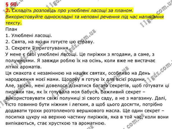 § 60. 2. Складіть розповідь про улюблені ласощі за планом. Використовуйте односкладні та неповні речення під час написання тексту. План 1. Улюблені ласощі. 2. Свята, на які ви готуєте цю страву. 3. Секрети її приготування. У мене є свої улюблені ласощі. Це пиріжки з ягодами, а саме, з полуницями. Я завжди роблю їх на осінь, коли вже не вистачає літніх ароматів. Ця смакота є незамінною на наших святах, особливо на День народження моєї мами. Щороку я готую їх для всієї родини. Але, звісно, мені довелося дізнатися багато секретів, щоб готувати ці пиріжки так, як їх готувала моя бабуся. Важливий секрет – використовувати свіжі полуниці зі свого саду, а не з магазину. Далі, тісто повинно бути ніжним і легким, а щоб цього досягти, потрібно додавати трохи розтопленого вершкового масла. Ще один секрет – посипка цукру на верхню частину пиріжків, яка в той час, коли вони випікаються, стає хрусткою та ароматною.