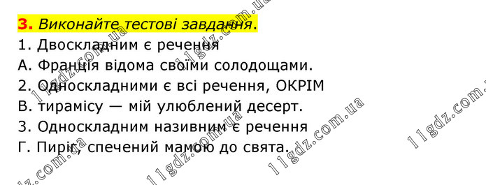 Виконайте тестові завдання. 1. Двоскладним є речення А. Франція відома своїми солодощами. 2. Односкладними є всі речення, ОКРІМ В. тирамісу — мій улюблений десерт. 3. Односкладним називним є речення Г. Пиріг, спечений мамою до свята.