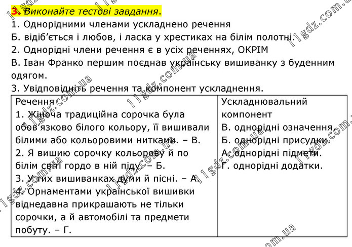 Виконайте тестові завдання. 1. Однорідними членами ускладнено речення Б. відіб’ється і любов, і ласка у хрестиках на білім полотні. 2. Однорідні члени речення є в усіх реченнях, ОКРІМ В. Іван Франко першим поєднав українську вишиванку з буденним одягом. 3. Увідповідніть речення та компонент ускладнення. Речення 1. Жіноча традиційна сорочка була обов’язково білого кольору, її вишивали білими або кольоровими нитками. – В. 2. Я вишию сорочку кольорову й по білім світі гордо в ній піду. – Б. 3. У тих вишиванках думи й пісні. – А. 4. Орнаментами української вишивки віднедавна прикрашають не тільки сорочки, а й автомобілі та предмети побуту. – Г. Ускладнювальний компонент В. однорідні означення. Б. однорідні присудки. А. однорідні підмети. Г. однорідні додатки.