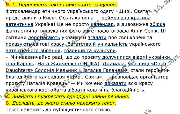 1. Перепишіть текст і виконайте завдання. Фотокалендар етнічного українського одягу «Щирі. Свята» представили в Києві. Ось така вона — неймовірно красива автентична Україна! Це не просто календар, а дивовижна збірка фантастично–вишуканих фото від етнофотографа Анни Сенік. Ці світлини допомагають українцям згадати про свої корені та показують світові красу, багатство й унікальність українського автентичного вбрання, традицій та культури. – Ми надзвичайно раді, що до проєкту долучилися відомі українки. тіна Кароль, Ната Жижченко (ONUKA), Джамала, учасниці «Dakh Daughters» Соломія Мельник і Наталка Галаневич стали героїнями благодійного календаря «Щирі. Свята», — розповідає організатор проєкту Наталія Кравець. — Ми хочемо показати всю красу українського костюма та зібрати кошти на благодійність. А. Знайдіть і підкресліть однорідні члени речення. Б. Дослідіть, до якого стилю належить текст. Текст належить до публіцистичного стилю.