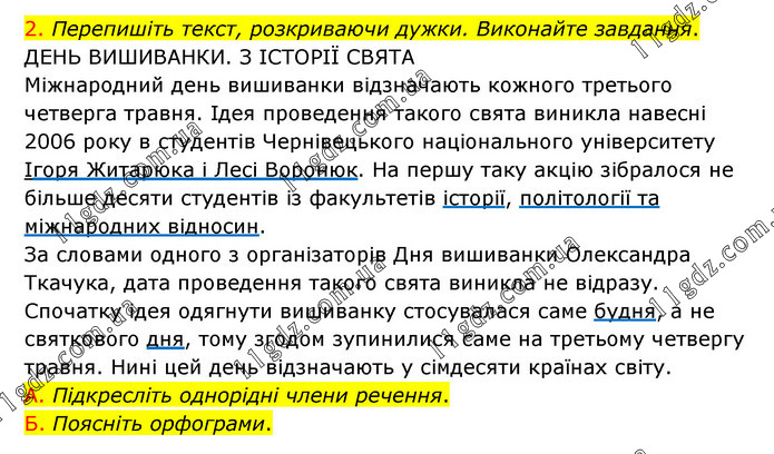 Перепишіть текст, розкриваючи дужки. Виконайте завдання. ДЕНЬ ВИШИВАНКИ. З ІСТОРІЇ СВЯТА Міжнародний день вишиванки відзначають кожного третього четверга травня. Ідея проведення такого свята виникла навесні 2006 року в студентів Чернівецького національного університету Ігоря Житарюка і Лесі Воронюк. На першу таку акцію зібралося не більше десяти студентів із факультетів історії, політології та міжнародних відносин. За словами одного з організаторів Дня вишиванки Олександра Ткачука, дата проведення такого свята виникла не відразу. Спочатку ідея одягнути вишиванку стосувалася саме будня, а не святкового дня, тому згодом зупинилися саме на третьому четвергу травня. Нині цей день відзначають у сімдесяти країнах світу. А. Підкресліть однорідні члени речення. Б. Поясніть орфограми.
