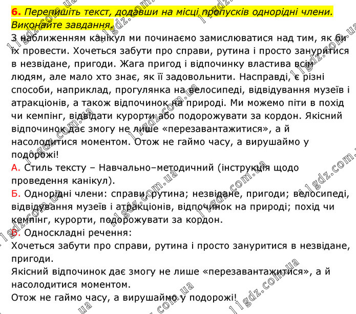 Перепишіть текст, додавши на місці пропусків однорідні члени. Виконайте завдання. З наближенням канікул ми починаємо замислюватися над тим, як би їх провести. Хочеться забути про справи, рутина і просто зануритися в незвідане, пригоди. Жага пригод і відпочинку властива всім людям, але мало хто знає, як її задовольнити. Насправді, є різні способи, наприклад, прогулянка на велосипеді, відвідування музеїв і атракціонів, а також відпочинок на природі. Ми можемо піти в похід чи кемпінг, відвідати курорти або подорожувати за кордон. Якісний відпочинок дає змогу не лише «перезавантажитися», а й насолодитися моментом. Отож не гаймо часу, а вирушаймо у подорожі! А. Стиль тексту – Навчально–методичний (інструкція щодо проведення канікул). Б. Однорідні члени: справи, рутина; незвідане, пригоди; велосипеді, відвідування музеїв і атракціонів, відпочинок на природі; похід чи кемпінг, курорти, подорожувати за кордон. В. Односкладні речення: Хочеться забути про справи, рутина і просто зануритися в незвідане, пригоди. Якісний відпочинок дає змогу не лише «перезавантажитися», а й насолодитися моментом. Отож не гаймо часу, а вирушаймо у подорожі!