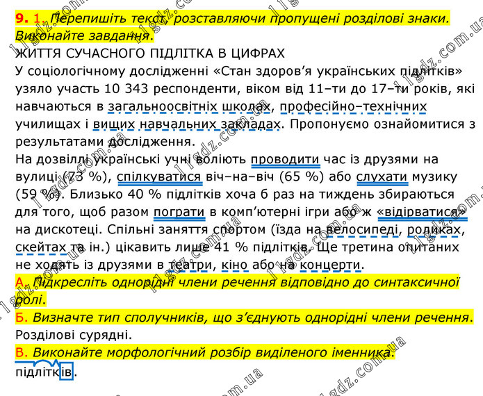 1. Перепишіть текст, розставляючи пропущені розділові знаки. Виконайте завдання. ЖИТТЯ СУЧАСНОГО ПІДЛІТКА В ЦИФРАХ У соціологічному дослідженні «Стан здоров’я українських підлітків» узяло участь 10 343 респонденти, віком від 11–ти до 17–ти років, які навчаються в загальноосвітніх школах, професійно–технічних училищах і вищих навчальних закладах. Пропонуємо ознайомитися з результатами дослідження. На дозвіллі українські учні воліють проводити час із друзями на вулиці (73 %), спілкуватися віч–на–віч (65 %) або слухати музику (59 %). Близько 40 % підлітків хоча б раз на тиждень збираються для того, щоб разом пограти в комп’ютерні ігри або ж «відірватися» на дискотеці. Спільні заняття спортом (їзда на велосипеді, роликах, скейтах та ін.) цікавить лише 41 % підлітків. Ще третина опитаних не ходять із друзями в театри, кіно або на концерти. A. Підкресліть однорідні члени речення відповідно до синтаксичної ролі. Б. Визначте тип сполучників, що з’єднують однорідні члени речення. Розділові сурядні. B. Виконайте морфологічний розбір виділеного іменника. підлітків.