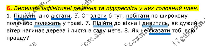 Випишіть інфінітивні речення та підкресліть у них головний член. 1. Пірнути, дно дістати. 3. От злізти б тут, побігати по широкому полю або полежать у траві. 7. Підійти до вікна і дивитись, як дужий вітер нагинає дерева і листя в саду мете. 8. Як не сказати тобі всю правду?