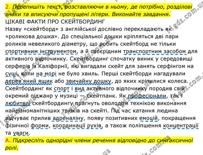 Перепишіть текст, розставляючи в ньому, де потрібно, розділові знаки та вписуючи пропущені літери. Виконайте завдання. ЦІКАВІ ФАКТИ ПРО СКЕЙТБОРДИНГ Назву «скейтборд» з англійської дослівно перекладають як «роликова дошка». До спеціальної дошки кріпляться дві пари роликів невеликого діаметру, що робить скейтборд не тільки спортивним інструментом, а й своєрідним транспортним засобом для активного відпочинку. Скейтбординг спочатку виник у середовищі серферів із Каліфорнії, які вигадали скейт для занять серфінгом на суші, коли на морі не було хвиль. Перші скейтборди нагадували дерев'яний ящик або звичайну дошку, до яких кріпилися колеса. Скейтбординг як спорт і вид активного відпочинку породив свій окремий піджанр у музиці — скейтпанк. Як професіонали, так і любителі скейтбордингу прагнуть оволодіти технікою виконання найрізноманітніших трюків на скейті. Під час катання людина відчуває прилив адреналіну, появу позитивних емоцій, покращення фізичної форми, координації рухів, а також поліпшення концентрації та уваги. А. Підкресліть однорідні члени речення відповідно до синтаксичної ролі.