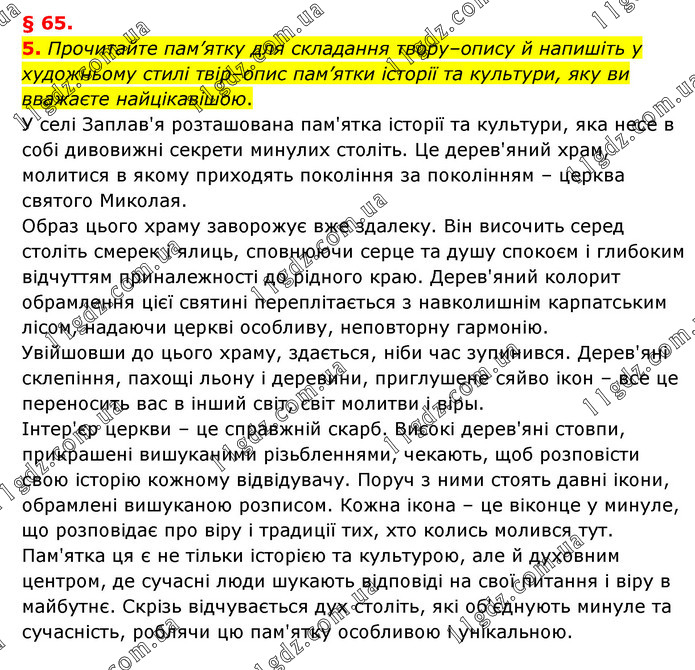 § 65. 5. Прочитайте пам’ятку для складання твору–опису й напишіть у художньому стилі твір–опис пам’ятки історії та культури, яку ви вважаєте найцікавішою. У селі Заплав'я розташована пам'ятка історії та культури, яка несе в собі дивовижні секрети минулих століть. Це дерев'яний храм, молитися в якому приходять покоління за поколінням – церква святого Миколая. Образ цього храму заворожує вже здалеку. Він височить серед століть смерек і ялиць, сповнюючи серце та душу спокоєм і глибоким відчуттям приналежності до рідного краю. Дерев'яний колорит обрамлення цієї святині переплітається з навколишнім карпатським лісом, надаючи церкві особливу, неповторну гармонію. Увійшовши до цього храму, здається, ніби час зупинився. Дерев'яні склепіння, пахощі льону і деревини, приглушене сяйво ікон – все це переносить вас в інший світ, світ молитви і віры. Інтер'єр церкви – це справжній скарб. Високі дерев'яні стовпи, прикрашені вишуканими різьбленнями, чекають, щоб розповісти свою історію кожному відвідувачу. Поруч з ними стоять давні ікони, обрамлені вишуканою розписом. Кожна ікона – це віконце у минуле, що розповідає про віру і традиції тих, хто колись молився тут. Пам'ятка ця є не тільки історією та культурою, але й духовним центром, де сучасні люди шукають відповіді на свої питання і віру в майбутнє. Скрізь відчувається дух століть, які об'єднують минуле та сучасність, роблячи цю пам'ятку особливою і унікальною.