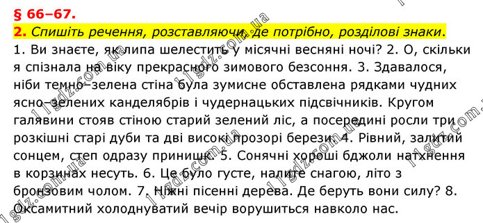 § 66–67. 2. Спишіть речення, розставляючи, де потрібно, розділові знаки. 1. Ви знаєте, як липа шелестить у місячні весняні ночі? 2. О, скільки я спізнала на віку прекрасного зимового безсоння. 3. Здавалося, ніби темно–зелена стіна була зумисне обставлена рядками чудних ясно–зелених канделябрів і чудернацьких підсвічників. Кругом галявини стояв стіною старий зелений ліс, а посередині росли три розкішні старі дуби та дві високі прозорі берези. 4. Рівний, залитий сонцем, степ одразу принишк. 5. Сонячні хороші бджоли натхнення в корзинах несуть. 6. Це було густе, налите снагою, літо з бронзовим чолом. 7. Ніжні пісенні дерева. Де беруть вони силу? 8. Оксамитний холоднуватий вечір ворушиться навколо нас.