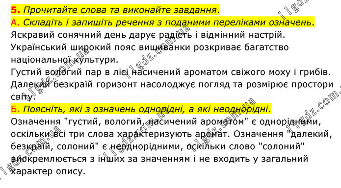 5. Прочитайте слова та виконайте завдання. А. Складіть і запишіть речення з поданими переліками означень. Яскравий сонячний день дарує радість і відмінний настрій. Український широкий пояс вишиванки розкриває багатство національної культури. Густий вологий пар в лісі насичений ароматом свіжого моху і грибів. Далекий безкраїй горизонт насолоджує погляд та розмірює простори світу. Б. Поясніть, які з означень однорідні, а які неоднорідні. Означення "густий, вологий, насичений ароматом" є однорідними, оскільки всі три слова характеризують аромат. Означення "далекий, безкраїй, солоний" є неоднорідними, оскільки слово "солоний" виокремлюється з інших за значенням і не входить у загальний характер опису.