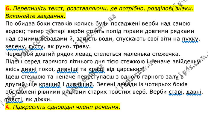 Перепишіть текст, розставляючи, де потрібно, розділові знаки. Виконайте завдання. По обидва боки ставків колись були посаджені верби над самою водою; тепер ті старі верби стоять попід горами довгими рядками над самими левадами й, замість води, спускають свої віти на пухку, зелену, густу, як руно, траву. Через той довгий рядок левад стелеться маленька стежечка. Підеш серед гарячого літнього дня тією стежкою і неначе ввійдеш у якісь дивні покої, дивніші та кращі від царських! Ідеш стежкою та неначе переступаєш з одного гарного залу в другий, ще кращий і дивніший. Зелені левади із чотирьох боків обставлені рівними рядками старих товстих верб. Верби старі, давні, товсті, як діжки. А. Підкресліть однорідні члени речення.