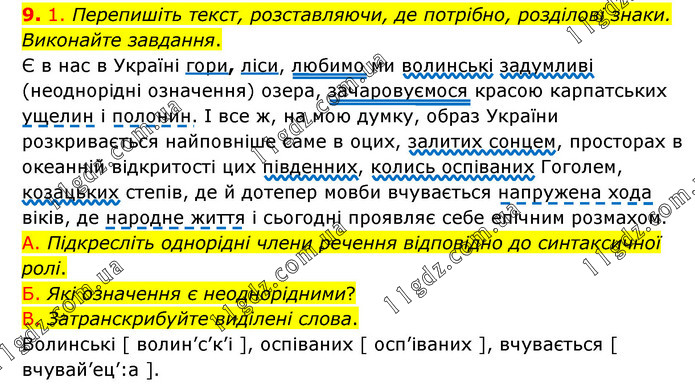 1. Перепишіть текст, розставляючи, де потрібно, розділові знаки. Виконайте завдання. Є в нас в Україні гори, ліси, любимо ми волинські задумливі (неоднорідні означення) озера, зачаровуємося красою карпатських ущелин і полонин. І все ж, на мою думку, образ України розкривається найповніше саме в оцих, залитих сонцем, просторах в океанній відкритості цих південних, колись оспіваних Гоголем, козацьких степів, де й дотепер мовби вчувається напружена хода віків, де народне життя і сьогодні проявляє себе епічним розмахом. A. Підкресліть однорідні члени речення відповідно до синтаксичної ролі. Б. Які означення є неоднорідними? B. Затранскрибуйте виділені слова. Волинські [ волин’с’к’і ], оспіваних [ осп’іваних ], вчувається [ вчувай’ец’:а ].