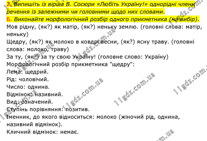 Випишіть із вірша В. Сосюри «Любіть Україну!» однорідні члени речення із залежними чи головними щодо них словами. Б. Виконайте морфологічний розбір одного прикметника (на вибір). Мов рідну, (як?) як матір, (як?) неньку землю. (головні слова: матір, неньку) Щедру, (як?) як молоко в ковдрі весни, (як?) ясну траву. (головні слова: молоко, траву) За ту, (як?) за ту свою Україну! (головне слово: Україну) Морфологічний розбір прикметника "щедру": Лема: щедрий. Рід: чоловічий. Число: однина. Відмінок: називний. Вид: означений. Ступінь порівняння: позитив. Іменник, до якого відноситься: молоко (жіночий рід, однина, називний відмінок). Кличний відмінок: немає.