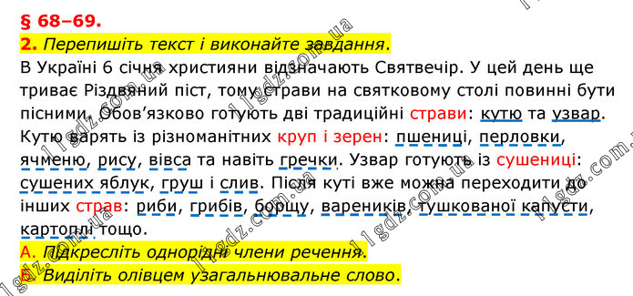 § 68–69. 2. Перепишіть текст і виконайте завдання. В Україні 6 січня християни відзначають Святвечір. У цей день ще триває Різдвяний піст, тому страви на святковому столі повинні бути пісними. Обов’язково готують дві традиційні страви: кутю та узвар. Кутю варять із різноманітних круп і зерен: пшениці, перловки, ячменю, рису, вівса та навіть гречки. Узвар готують із сушениці: сушених яблук, груш і слив. Після куті вже можна переходити до інших страв: риби, грибів, борщу, вареників, тушкованої капусти, картоплі тощо. А. Підкресліть однорідні члени речення. Б. Виділіть олівцем узагальнювальне слово.
