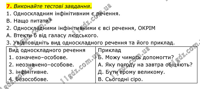 Виконайте тестові завдання. 1. Односкладним інфінітивним є речення. В. Нащо питати? 2. Односкладними інфінітивними є всі речення, ОКРІМ А. Втекти б від галасу людського. 3. Увідповідніть вид односкладного речення та його приклад. Вид односкладного речення 1. означено–особове. 2. неозначено–особове. 3. інфінітивне. 4. безособове. Приклад Б. Можу чимось допомогти? А. Яку погоду на завтра обіцяють? Д. Бути грому великому. В. Сьогодні сіро.