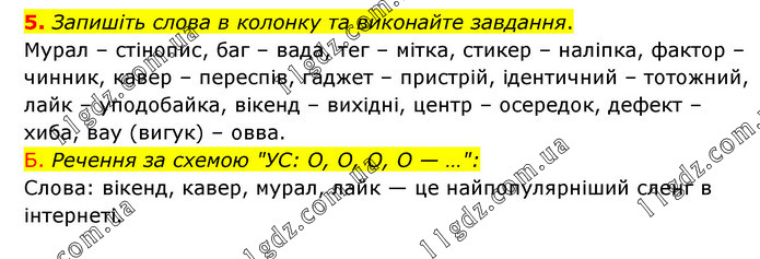 Запишіть слова в колонку та виконайте завдання. Мурал – стінопис, баг – вада, тег – мітка, стикер – наліпка, фактор – чинник, кавер – переспів, гаджет – пристрій, ідентичний – тотожний, лайк – уподобайка, вікенд – вихідні, центр – осередок, дефект – хиба, вау (вигук) – овва. Б. Речення за схемою "УС: О, О, О, О — …": Слова: вікенд, кавер, мурал, лайк — це найпопулярніший сленг в інтернеті.