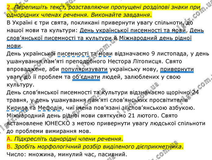 Перепишіть текст, розставляючи пропущені розділові знаки при однорідних членах речення. Виконайте завдання. В Україні є три свята, покликані привернути увагу спільноти, до нашої мови та культури: День української писемності та мови, День слов’янської писемності та культури й Міжнародний день рідної мови. День української писемності та мови відзначаємо 9 листопада, у день ушанування пам’яті преподобного Нестора Літописця. Свято впроваджене, аби популяризувати українську мову, привернути увагу до її проблем та об’єднати людей, залюблених у свою культуру. День слов’янської писемності та культури відзначаємо щорічно 24 травня, у день ушанування пам’яті слов’янських просвітителів Кирила та Мефодія, чиї імена пов’язані зі слов’янською азбукою. Міжнародний день рідної мови святкуємо 21 лютого. Свято встановлене ЮНЕСКО з метою привернути увагу людської спільноти до проблеми вимирання мов. A. Підкресліть однорідні члени речення. B. Зробіть морфологічний розбір виділеного дієприкметника. Число: множина, минулий час, пасивний.