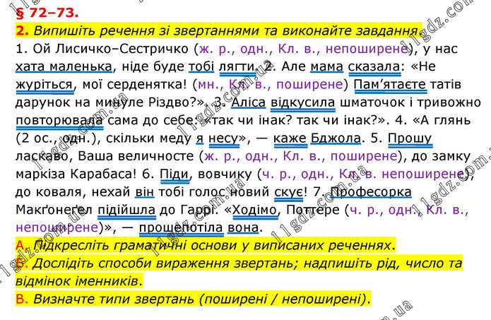 § 72–73. 2. Випишіть речення зі звертаннями та виконайте завдання. 1. Ой Лисичко–Сестричко (ж. р., одн., Кл. в., непоширене), у нас хата маленька, ніде буде тобі лягти. 2. Але мама сказала: «Не журіться, мої серденятка! (мн., Кл. в., поширене) Пам’ятаєте татів дарунок на минуле Різдво?». 3. Аліса відкусила шматочок і тривожно повторювала сама до себе: «так чи інак? так чи інак?». 4. «А глянь (2 ос., одн.), скільки меду я несу», — каже Бджола. 5. Прошу ласкаво, Ваша величносте (ж. р., одн., Кл. в., поширене), до замку маркіза Карабаса! 6. Піди, вовчику (ч. р., одн., Кл. в. непоширене), до коваля, нехай він тобі голос новий скує! 7. Професорка Макґонеґел підійшла до Гаррі. «Ходімо, Поттере (ч. р., одн., Кл. в., непоширене)», — прошепотіла вона. A. Підкресліть граматичні основи у виписаних реченнях. Б. Дослідіть способи вираження звертань; надпишіть рід, число та відмінок іменників. B. Визначте типи звертань (поширені / непоширені).