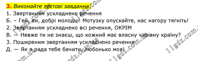 Виконайте тестові завдання. 1. Звертанням ускладнено речення Б. – Гей, ви, добрі молодці! Мотузку опускайте, нас нагору тягніть! 2. Звертанням ускладнено всі речення, ОКРІМ В. — Невже ти не знаєш, що кожний має власну чарівну країну? 3. Поширеним звертанням ускладнено речення Д. — Як я рада тебе бачити, любонько моя!