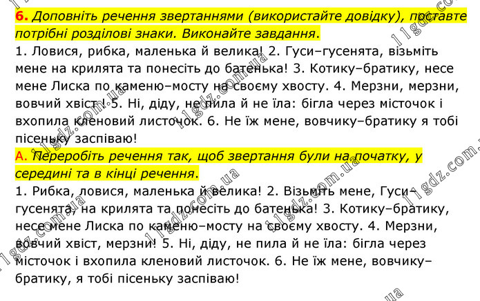 Доповніть речення звертаннями (використайте довідку), поставте потрібні розділові знаки. Виконайте завдання. 1. Ловися, рибка, маленька й велика! 2. Гуси–гусенята, візьміть мене на крилята та понесіть до батенька! 3. Котику–братику, несе мене Лиска по каменю–мосту на своєму хвосту. 4. Мерзни, мерзни, вовчий хвіст ! 5. Ні, діду, не пила й не їла: бігла через місточок і вхопила кленовий листочок. 6. Не їж мене, вовчику–братику я тобі пісеньку заспіваю! А. Переробіть речення так, щоб звертання були на початку, у середині та в кінці речення. 1. Рибка, ловися, маленька й велика! 2. Візьміть мене, Гуси–гусенята, на крилята та понесіть до батенька! 3. Котику–братику, несе мене Лиска по каменю–мосту на своєму хвосту. 4. Мерзни, вовчий хвіст, мерзни! 5. Ні, діду, не пила й не їла: бігла через місточок і вхопила кленовий листочок. 6. Не їж мене, вовчику–братику, я тобі пісеньку заспіваю!