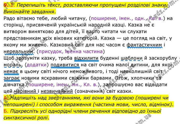 1. Перепишіть текст, розставляючи пропущені розділові знаки. Виконайте завдання. Радо вітаємо тебе, любий читачу, (поширене, імен., одн., Кл. в.) на сторінці, присвяченій українській народній казці. Казка не є витвором винятково для дітей, її варто читати чи слухати представникам усіх вікових категорій. Казка — це погляд на світ, у якому ми живемо. Казковий світ для нас часом є фантастичним і нереальним. (присудок, іменна частина) Щоб зрозуміти казку, треба відхилити буденні шаблони й заскорублу мораль, (додатки) подивитися на світ очима малої дитини, для якої немає в цьому світі нічого неможливого, і тоді навколишній світ заграє новими яскравими свіжими барвами. Отож, хлопчики та дівчатка (поширене, імен., мн., Кл. в.), запрошуємо вас відвідати цей чарівний і незвичайний (означення) світ казки. А. Надпишіть над звертаннями, які вони за будовою (поширені чи непоширені) і способом вираження (частина мови, число, відмінок). Б. Підкресліть усі однорідні члени речення відповідно до їхньої синтаксичної ролі.