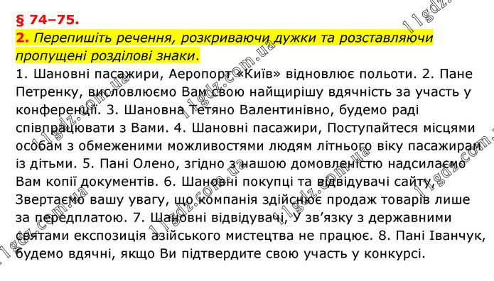 74–75. 2. Перепишіть речення, розкриваючи дужки та розставляючи пропущені розділові знаки. 1. Шановні пасажири, Аеропорт «Київ» відновлює польоти. 2. Пане Петренку, висловлюємо Вам свою найщирішу вдячність за участь у конференції. 3. Шановна Тетяно Валентинівно, будемо раді співпрацювати з Вами. 4. Шановні пасажири, Поступайтеся місцями особам з обмеженими можливостями людям літнього віку пасажирам із дітьми. 5. Пані Олено, згідно з нашою домовленістю надсилаємо Вам копії документів. 6. Шановні покупці та відвідувачі сайту, Звертаємо вашу увагу, що компанія здійснює продаж товарів лише за передплатою. 7. Шановні відвідувачі, У зв’язку з державними святами експозиція азійського мистецтва не працює. 8. Пані Іванчук, будемо вдячні, якщо Ви підтвердите свою участь у конкурсі.