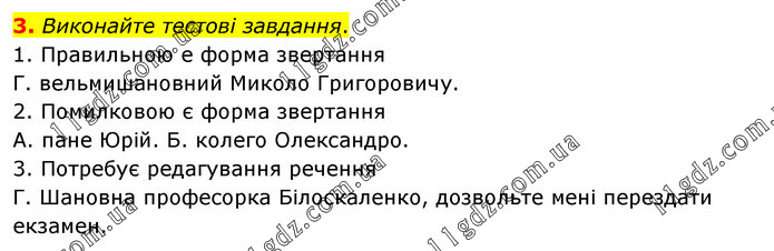 Виконайте тестові завдання. 1. Правильною е форма звертання Г. вельмишановний Миколо Григоровичу. 2. Помилковою є форма звертання А. пане Юрій. Б. колего Олександро. 3. Потребує редагування речення Г. Шановна професорка Білоскаленко, дозвольте мені перездати екзамен.