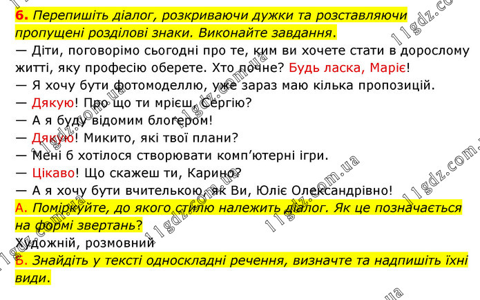 Перепишіть діалог, розкриваючи дужки та розставляючи пропущені розділові знаки. Виконайте завдання. — Діти, поговорімо сьогодні про те, ким ви хочете стати в дорослому житті, яку професію оберете. Хто почне? Будь ласка, Маріє! — Я хочу бути фотомоделлю, уже зараз маю кілька пропозицій. — Дякую! Про що ти мрієш, Сергію? — А я буду відомим блогером! — Дякую! Микито, які твої плани? — Мені б хотілося створювати комп’ютерні ігри. — Цікаво! Що скажеш ти, Карино? — А я хочу бути вчителькою, як Ви, Юліє Олександрівно! А. Поміркуйте, до якого стилю належить діалог. Як це позначається на формі звертань? Художній, розмовний Б. Знайдіть у тексті односкладні речення, визначте та надпишіть їхні види.