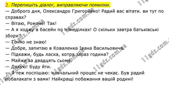 Перепишіть діалог, виправляючи помилки. — Доброго дня, Олександро Григоріївно! Радий вас вітати. ви тут по справах? — Вітаю, Романе! Так! — А я ходжу в басейн по понеділках! О скільки завтра батьківські збори? — Точно не знаю! — Добре, запитаю в Коваленка Івана Васильовича. — Підкажи, будь ласка, котра зараз година? — Майже за двадцять сьома. — Дякую! Буду йти. — Я теж поспішаю: навчальний процес не чекає. Був радий побалакати з вами! Найкращі побажання вашій родині!