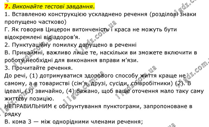 Виконайте тестові завдання. 1. Вставленою конструкцією ускладнено речення (розділові знаки пропущено частково) Г. Як говорив Цицерон витонченість і краса не можуть бути відокремлені від здоров’я. 2. Пунктуаційну помилку допущено в реченні В. Принаймні, важливо лише те, наскільки ви зможете включити в роботу необхідні для виконання вправи м’язи. 3. Прочитайте речення. До речі, (1) дотримуватися здорового способу життя краще не самому, а в товаристві (сім’я, друзі, сусіди, співробітники) (2). В ідеалі, (3) звичайно, (4) бажано, щоб ваше оточення мало таку саму життєву позицію. НЕПРАВИЛЬНИМ є обґрунтування пунктограми, запропоноване в рядку В. кома 3 — між однорідними членами речення;