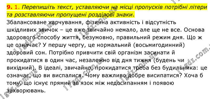 1. Перепишіть текст, уставляючи на місці пропусків потрібні літери та розставляючи пропущені розділові знаки. Збалансоване харчування, фізична активність і відсутність шкідливих звичок – це вже звичайно немало, але ще не все. Основа здорового способу життя, безумовно, правильний режим дня. Що ж це означає? У першу чергу, це нормальний (восьмигодинний) здоровий сон. Потрібно привчити свій організм засинати й прокидатися в один час, незалежно від дня тижня (будень чи вихідний). В ідеалі, звичайно, прокидатися треба без будильника: це означає, що ви виспалися. Чому важливо добре висипатися? Хоча б тому, що існує прямий зв’язок між недосипанням і появою захворювань.