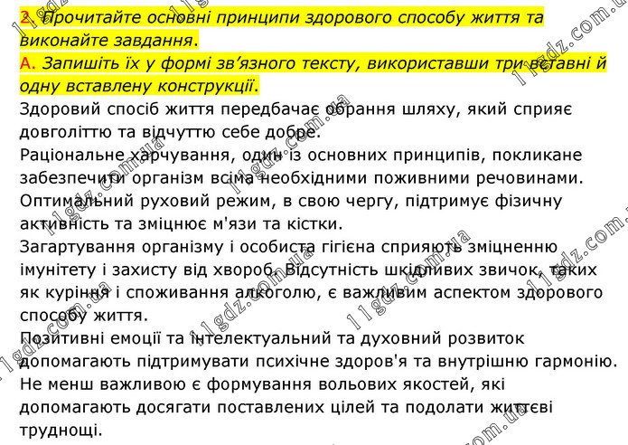 Прочитайте основні принципи здорового способу життя та виконайте завдання. А. Запишіть їх у формі зв’язного тексту, використавши три вставні й одну вставлену конструкції. Здоровий спосіб життя передбачає обрання шляху, який сприяє довголіттю та відчуттю себе добре. Раціональне харчування, один із основних принципів, покликане забезпечити організм всіма необхідними поживними речовинами. Оптимальний руховий режим, в свою чергу, підтримує фізичну активність та зміцнює м'язи та кістки. Загартування організму і особиста гігієна сприяють зміцненню імунітету і захисту від хвороб. Відсутність шкідливих звичок, таких як куріння і споживання алкоголю, є важливим аспектом здорового способу життя. Позитивні емоції та інтелектуальний та духовний розвиток допомагають підтримувати психічне здоров'я та внутрішню гармонію. Не менш важливою є формування вольових якостей, які допомагають досягати поставлених цілей та подолати життєві труднощі.