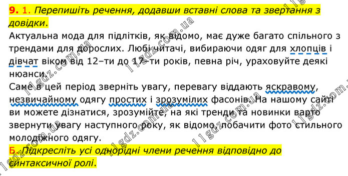 1. Перепишіть речення, додавши вставні слова та звертання з довідки. Актуальна мода для підлітків, як відомо, має дуже багато спільного з трендами для дорослих. Любі читачі, вибираючи одяг для хлопців і дівчат віком від 12–ти до 17–ти років, певна річ, ураховуйте деякі нюанси. Саме в цей період зверніть увагу, перевагу віддають яскравому, незвичайному одягу простих і зрозумілих фасонів. На нашому сайті ви можете дізнатися, зрозумійте, на які тренди та новинки варто звернути увагу наступного року, як відомо, побачити фото стильного молодіжного одягу. Б. Підкресліть усі однорідні члени речення відповідно до синтаксичної ролі.