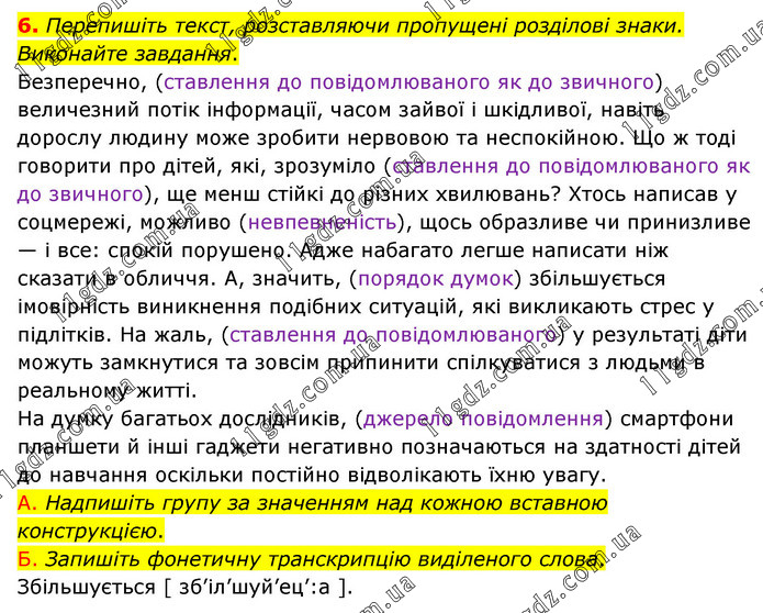 Перепишіть текст, розставляючи пропущені розділові знаки. Виконайте завдання. Безперечно, (ставлення до повідомлюваного як до звичного) величезний потік інформації, часом зайвої і шкідливої, навіть дорослу людину може зробити нервовою та неспокійною. Що ж тоді говорити про дітей, які, зрозуміло (ставлення до повідомлюваного як до звичного), ще менш стійкі до різних хвилювань? Хтось написав у соцмережі, можливо (невпевненість), щось образливе чи принизливе — і все: спокій порушено. Адже набагато легше написати ніж сказати в обличчя. А, значить, (порядок думок) збільшується імовірність виникнення подібних ситуацій, які викликають стрес у підлітків. На жаль, (ставлення до повідомлюваного) у результаті діти можуть замкнутися та зовсім припинити спілкуватися з людьми в реальному житті. На думку багатьох дослідників, (джерело повідомлення) смартфони планшети й інші гаджети негативно позначаються на здатності дітей до навчання оскільки постійно відволікають їхню увагу. А. Надпишіть групу за значенням над кожною вставною конструкцією. Б. Запишіть фонетичну транскрипцію виділеного слова. Збільшується [ зб’іл’шуй’ец’:а ].