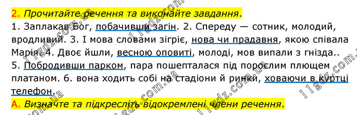 Прочитайте речення та виконайте завдання. 1. Заплакав Бог, побачивши загін. 2. Спереду — сотник, молодий, вродливий. 3. І мова словами зігріє, нова чи прадавня, якою співала Марія. 4. Двоє йшли, весною оповиті, молоді, мов випали з гнізда.. 5. Побродивши парком, пара пошепталася під порослим плющем платаном. 6. вона ходить собі на стадіони й ринки, ховаючи в куртці телефон. А. Визначте та підкресліть відокремлені члени речення.