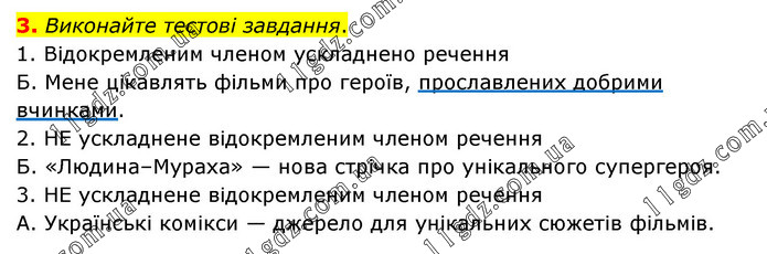 Виконайте тестові завдання. 1. Відокремленим членом ускладнено речення Б. Мене цікавлять фільми про героїв, прославлених добрими вчинками. 2. НЕ ускладнене відокремленим членом речення Б. «Людина–Мураха» — нова стрічка про унікального супергероя. 3. НЕ ускладнене відокремленим членом речення А. Українські комікси — джерело для унікальних сюжетів фільмів